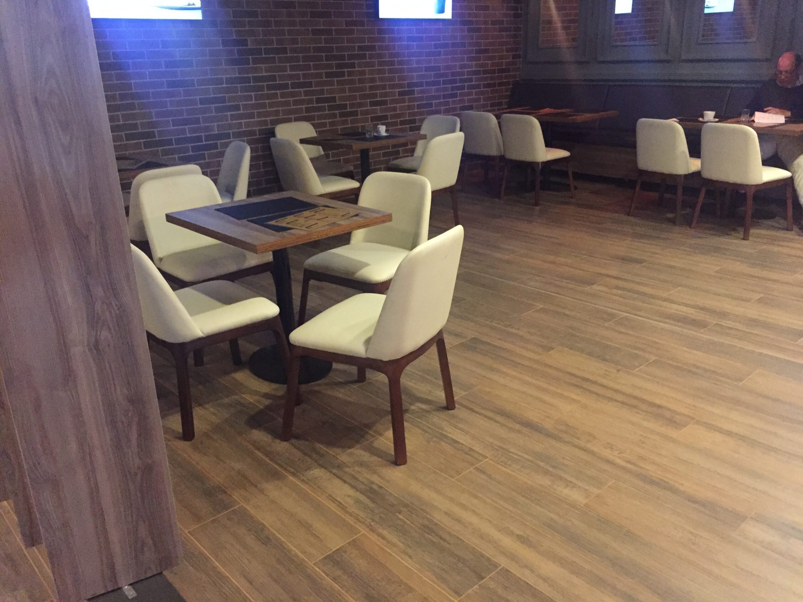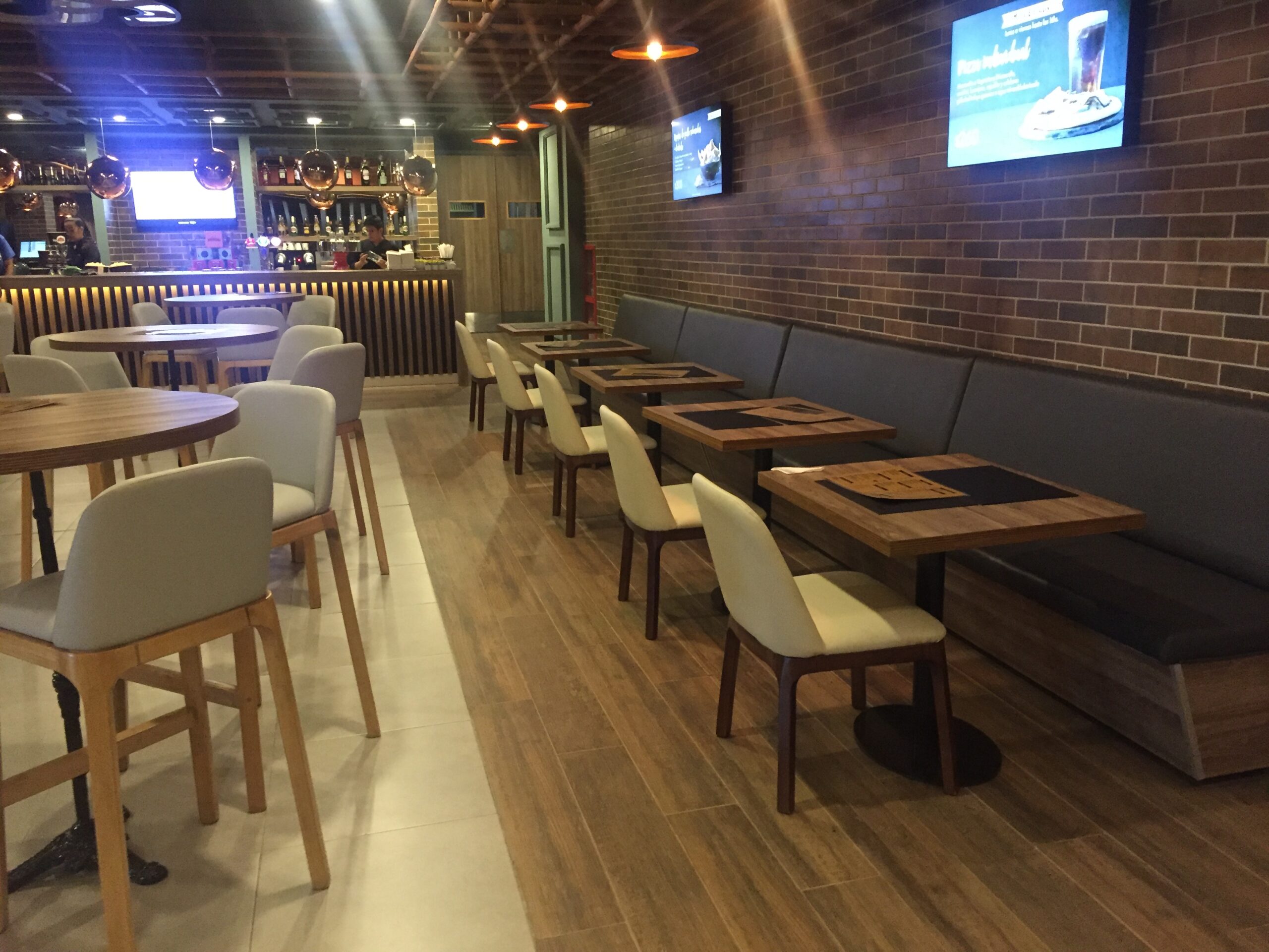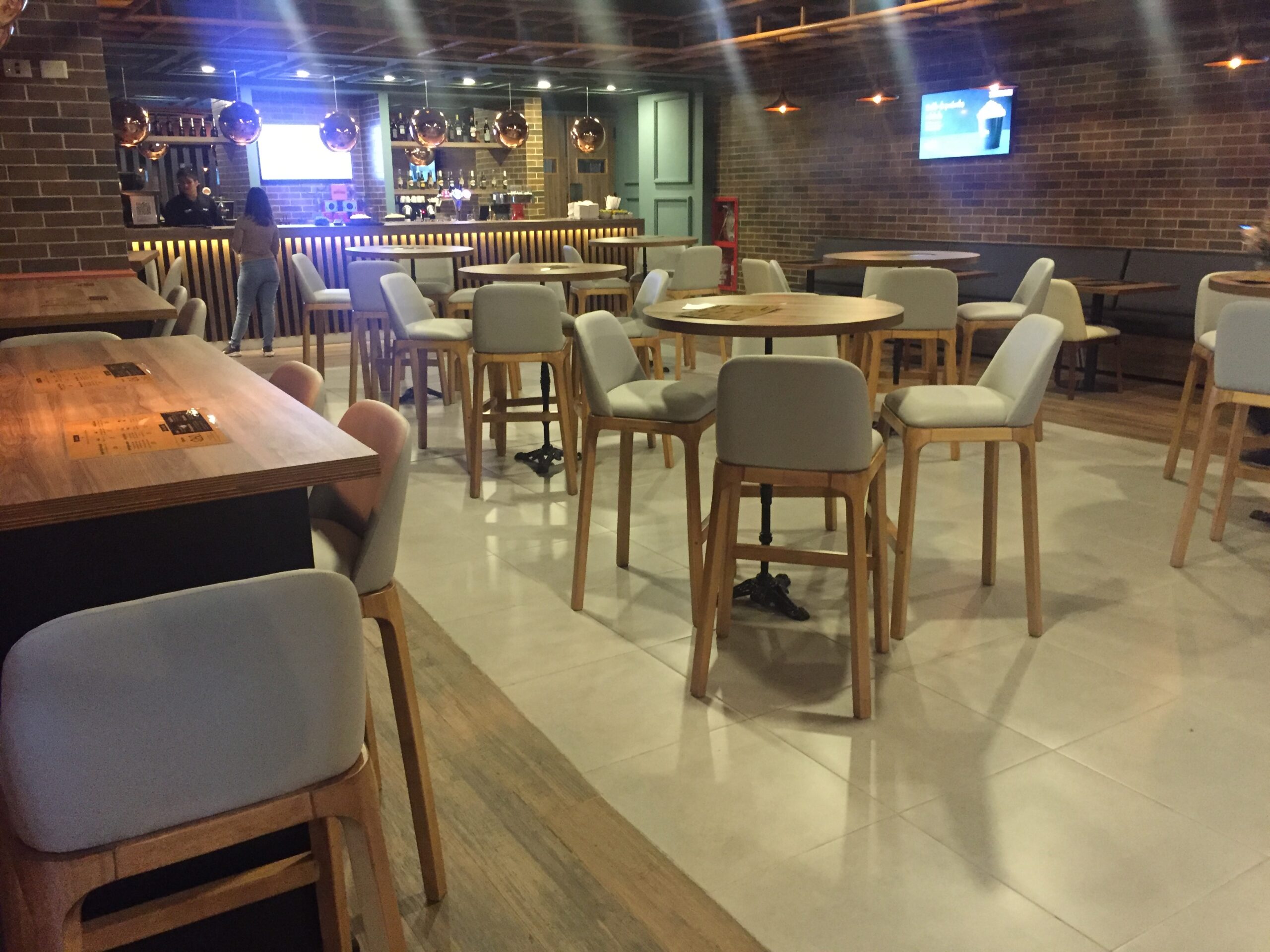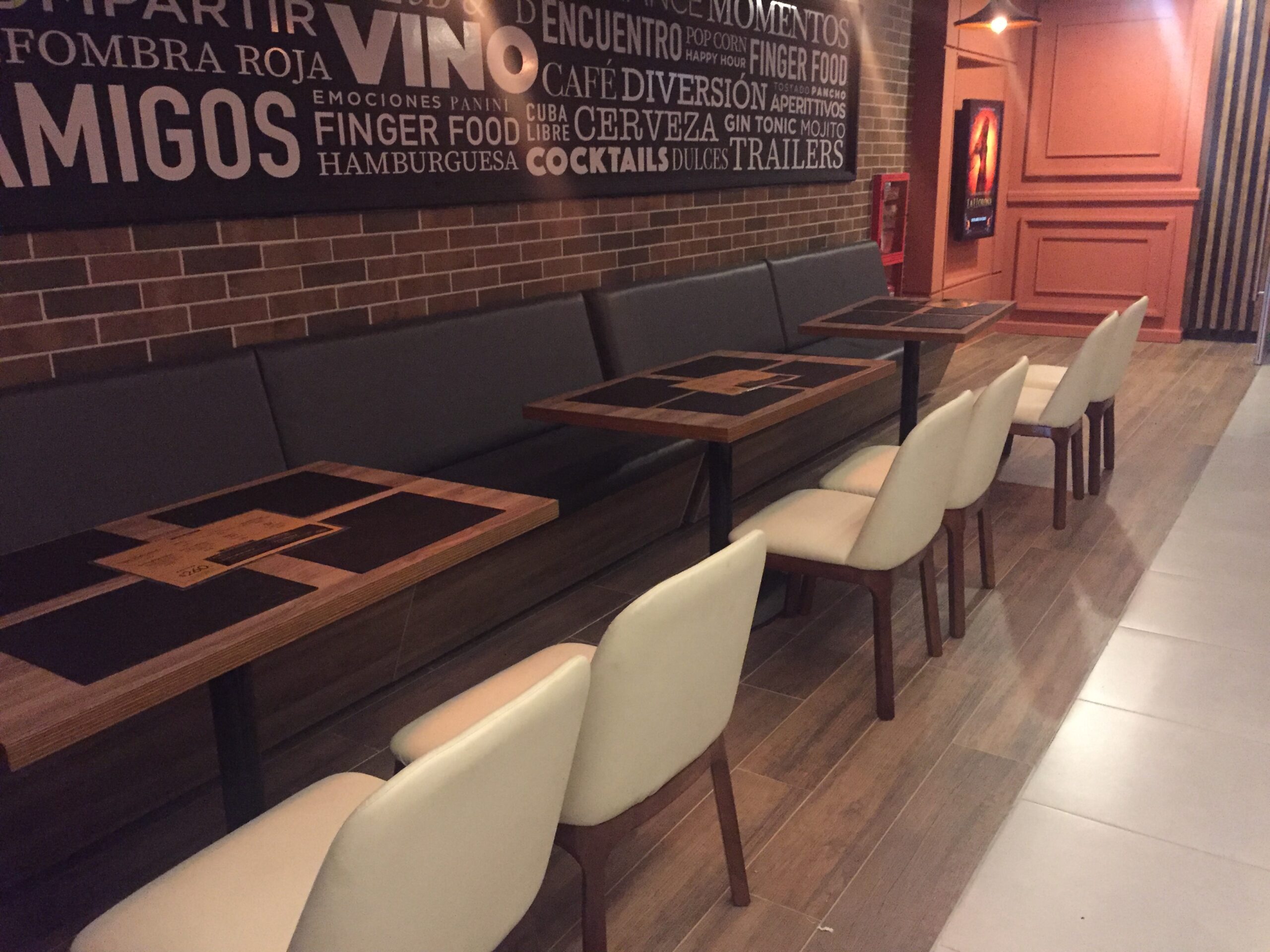 La intervención incluyó mesas, sillas y banquetas tapizadas, seleccionadas para integrarse a la identidad del ambiente y responder al uso diario propio de un espacio comercial con circulación constante. El objetivo fue lograr una propuesta visualmente sólida, cómoda para el usuario y coherente con la estética general del lugar.